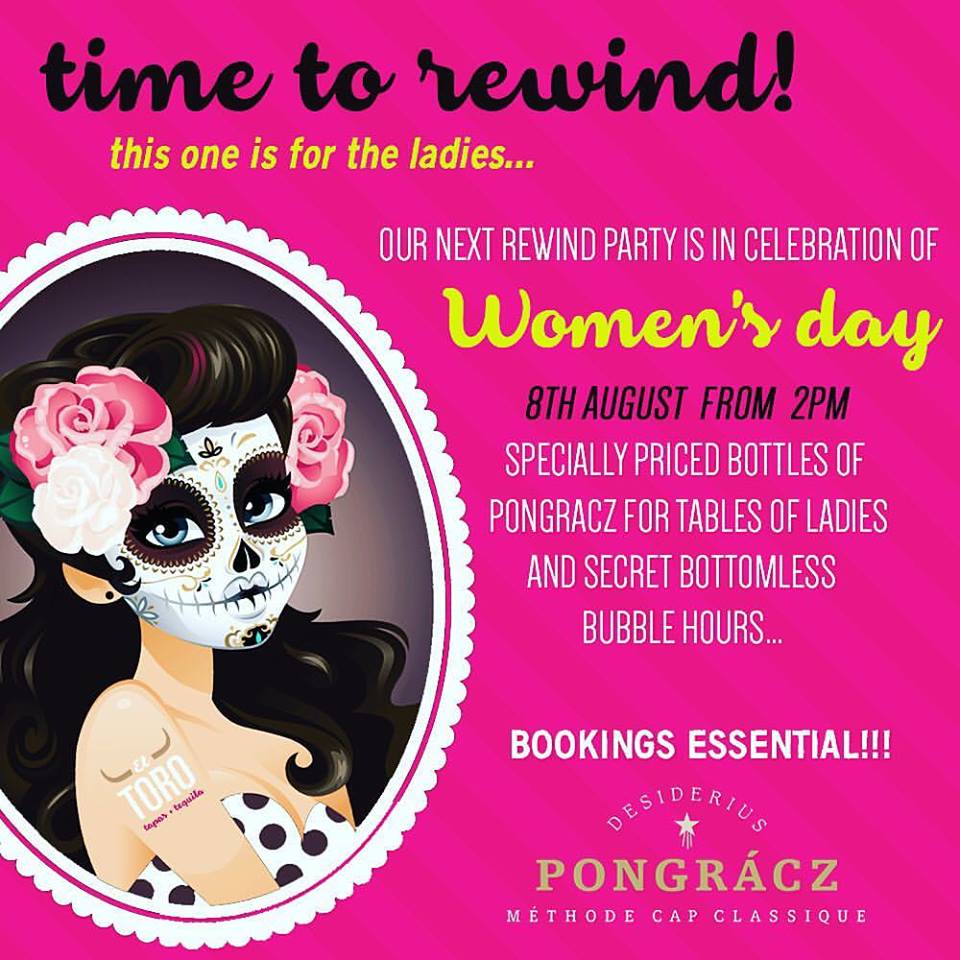 The next Rewind Party at El Toro is in celebration of Women’s Day on the 8th of August. It starts from 14h00 with specially priced bottles of Pongracz for tables of ladies and a secret bottomless bubble hours. Make sure to reserve your spot for this awesome event; booking is essential.