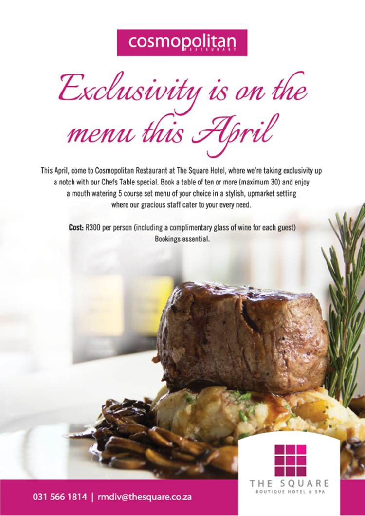 During April, they are taking exclusivity up a notch with their Chef’s Table special. Book a table of ten ore more and enjoy a mouth-watering five course set menu of your choice in a stylish, upmarket setting. This five course menu will cost R300 per person and booking is essential!