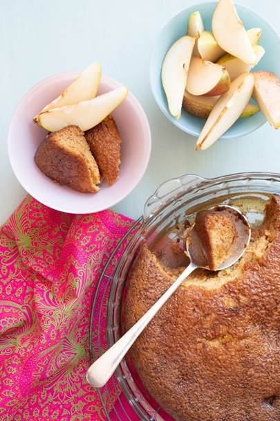 - Prick the warm pudding with a fork and pour the warm syrup over. Allow the pudding to absorb the syrup. The pudding will sink quite a bit as it absorbs the syrup. Serve warm with fresh fruit of your choice like pears or bananas.