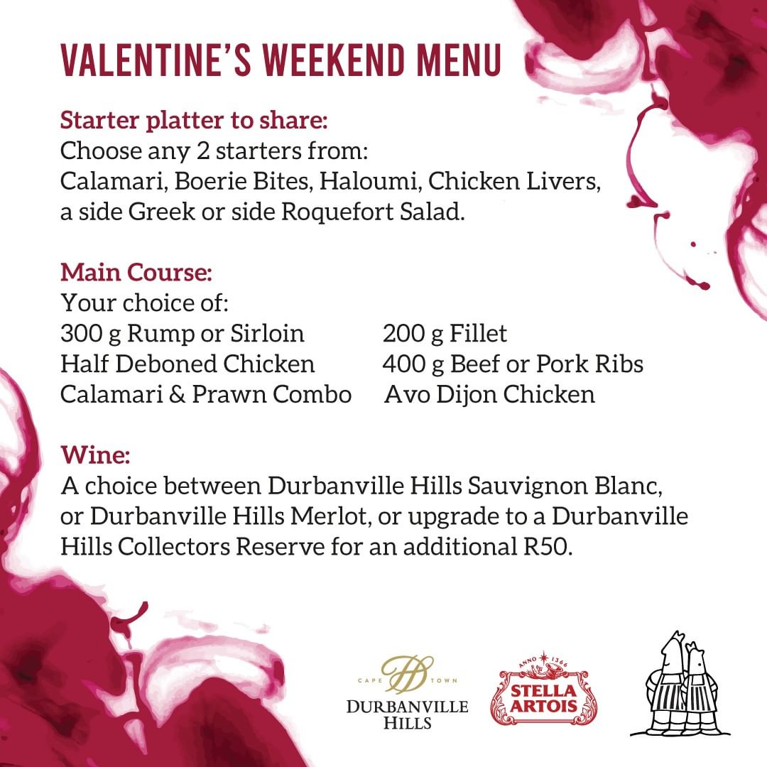 This coming Valentine’s weekend (Friday 11 – Mon 14 February) book the ‘Date Night’ special (@R550 per couple) at Butcher’s Grill and receive either a complimentary glass of Durbanville Hills Honey Suckle Sparkling or a Stella beer per person.