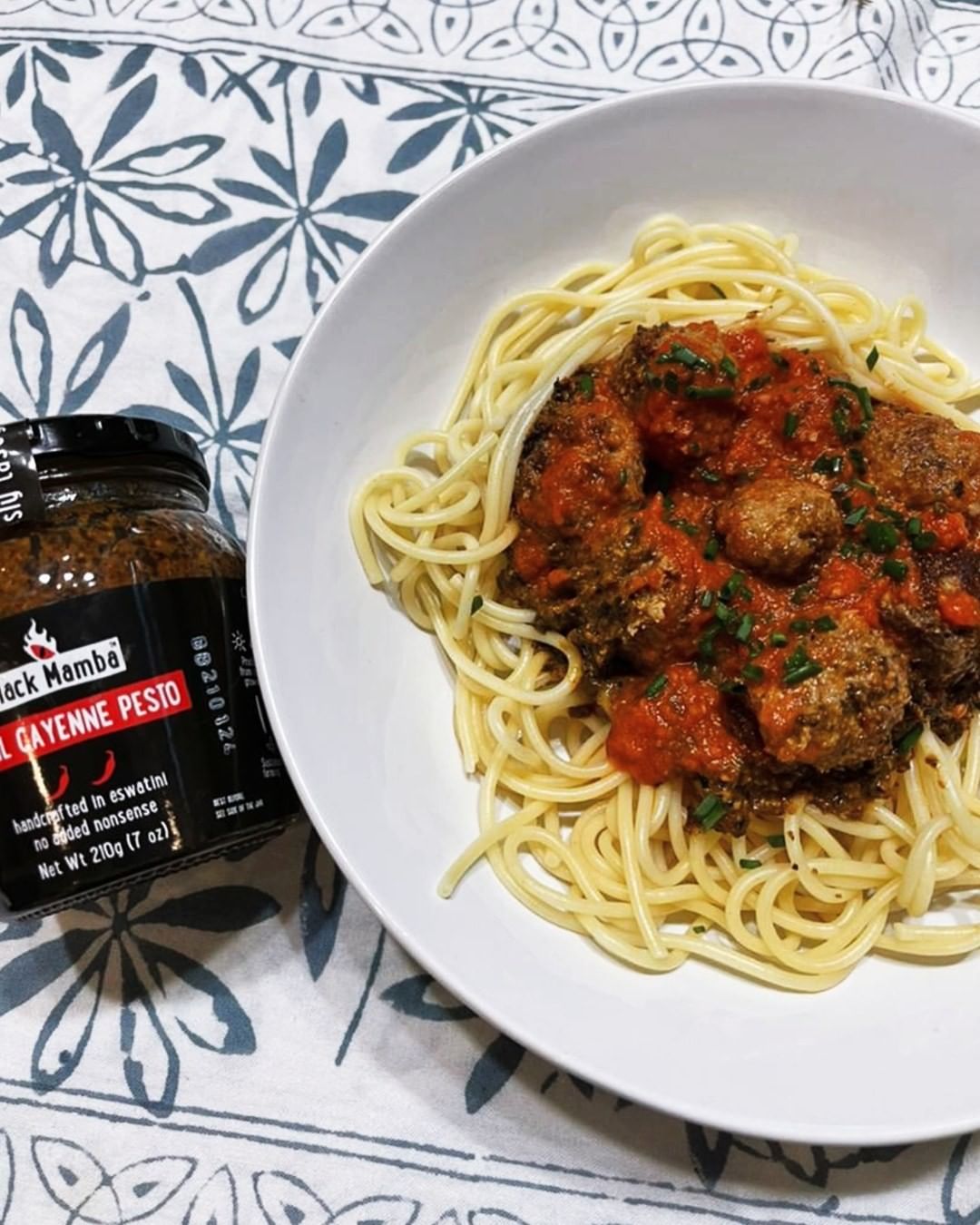 Sometimes the same old pasta night gets boring and you are looking to spruce up that old trusted recipe a bit. Enter Black Mamba Foods. They have all the products to bring some spice and intense flavour to your classic dishes. Next time you are hosting Spaghetti Meatball night, change the game with Black Mamba Basil & Cayenne pesto.