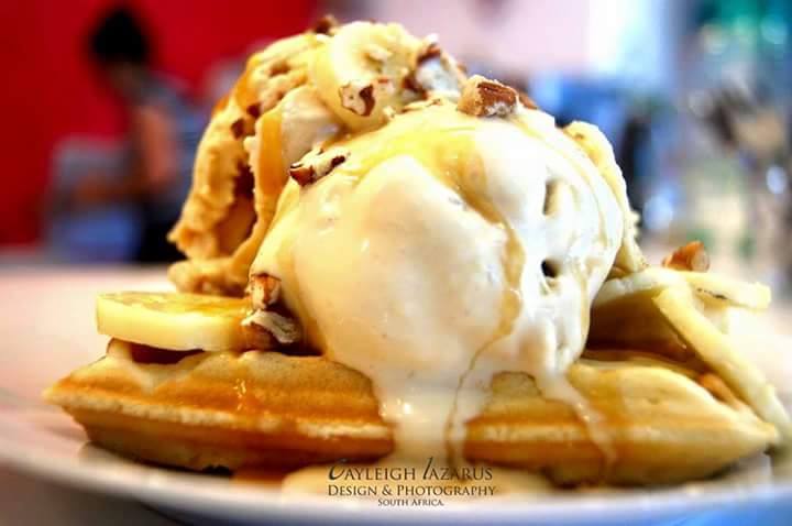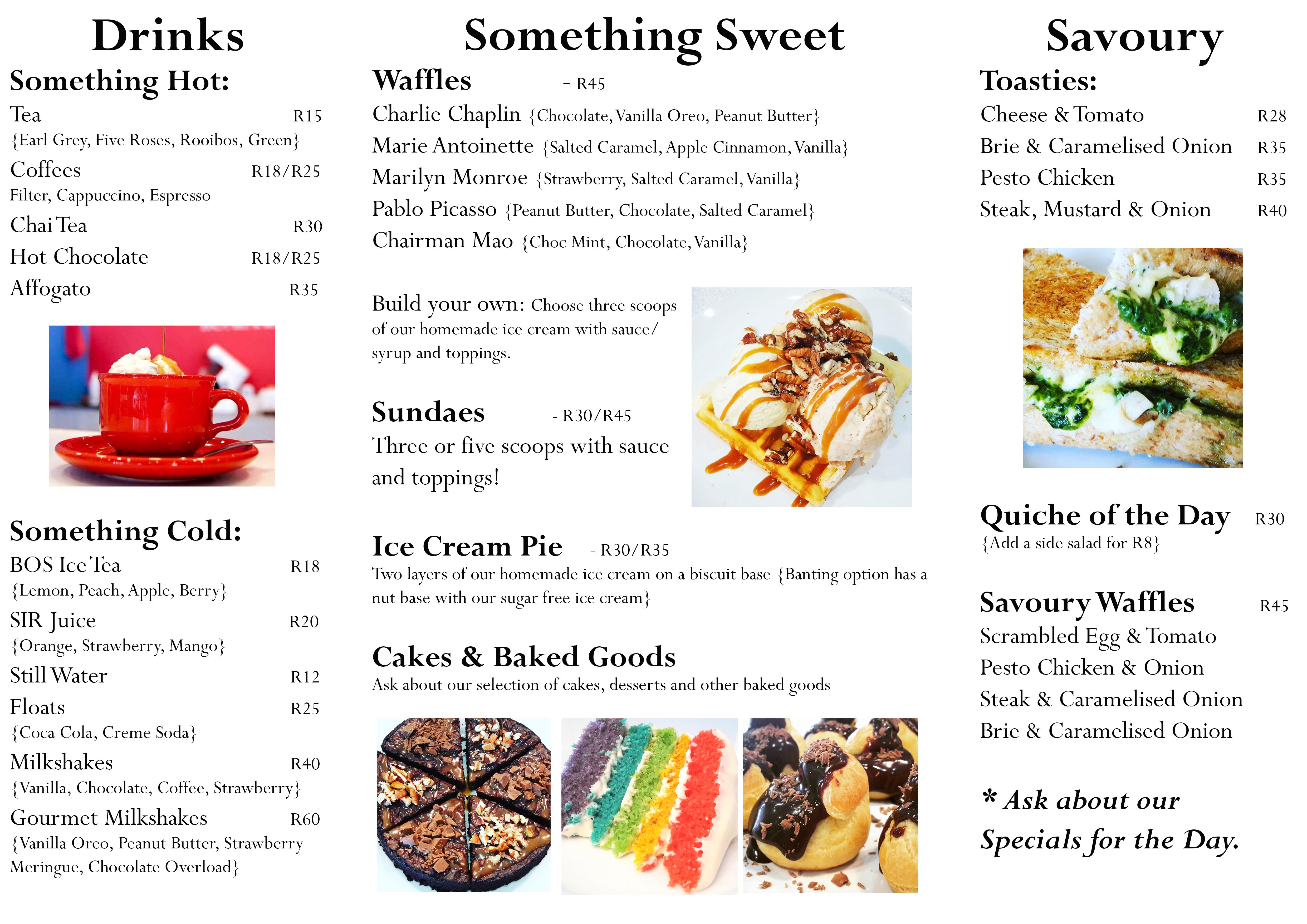 They have thirteen permanent flavours, as well as limited banting and vegan ice cream options, and a new, temporary flavour each month. Apart from ice cream, they also make our own waffles, cakes, brownies, smudgies, apple crumble and more. The toasties are made with homemade mayo and caramelised onion, which makes them extra special! Also serving Terbodore coffees and BOS products.