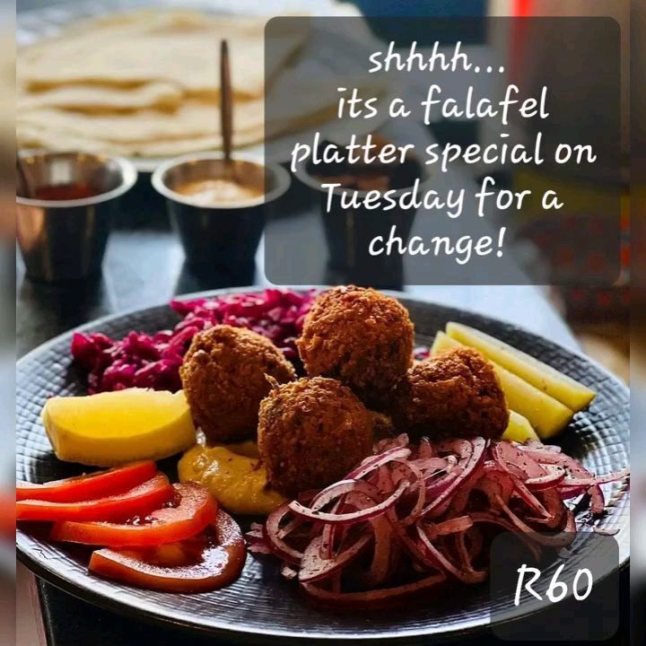 Every Tuesday, enjoy a Falafel platter special for only R60.