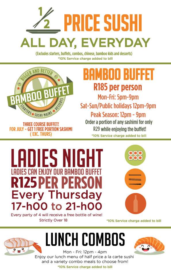 New times have been announced at Bamboo Sushi Lounge. Now you get even more time to enjoy the R185 sushi buffet special that we have all grown to love.From Monday to Friday, the buffet is available from 17h00 – 21h00, while on weekends and public holidays the menu is available for nearly the entire day until 21h00.