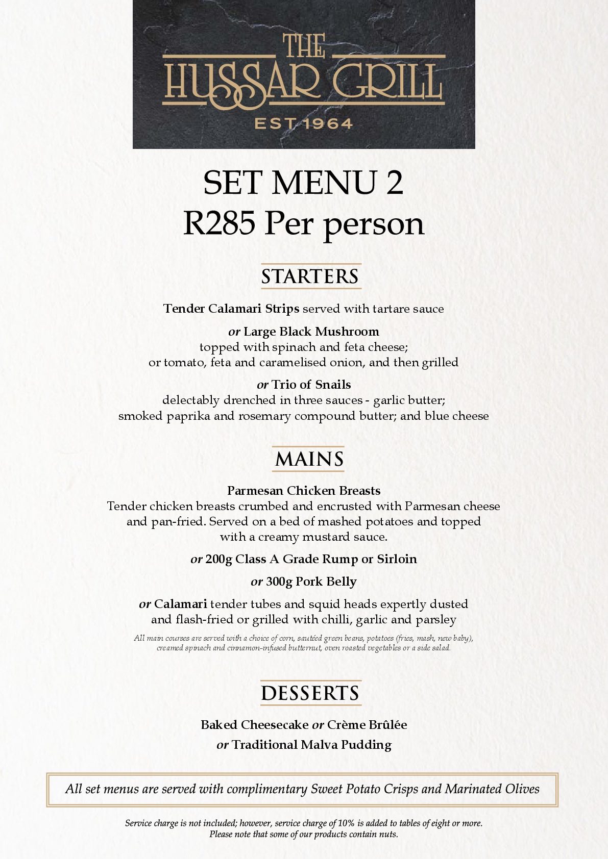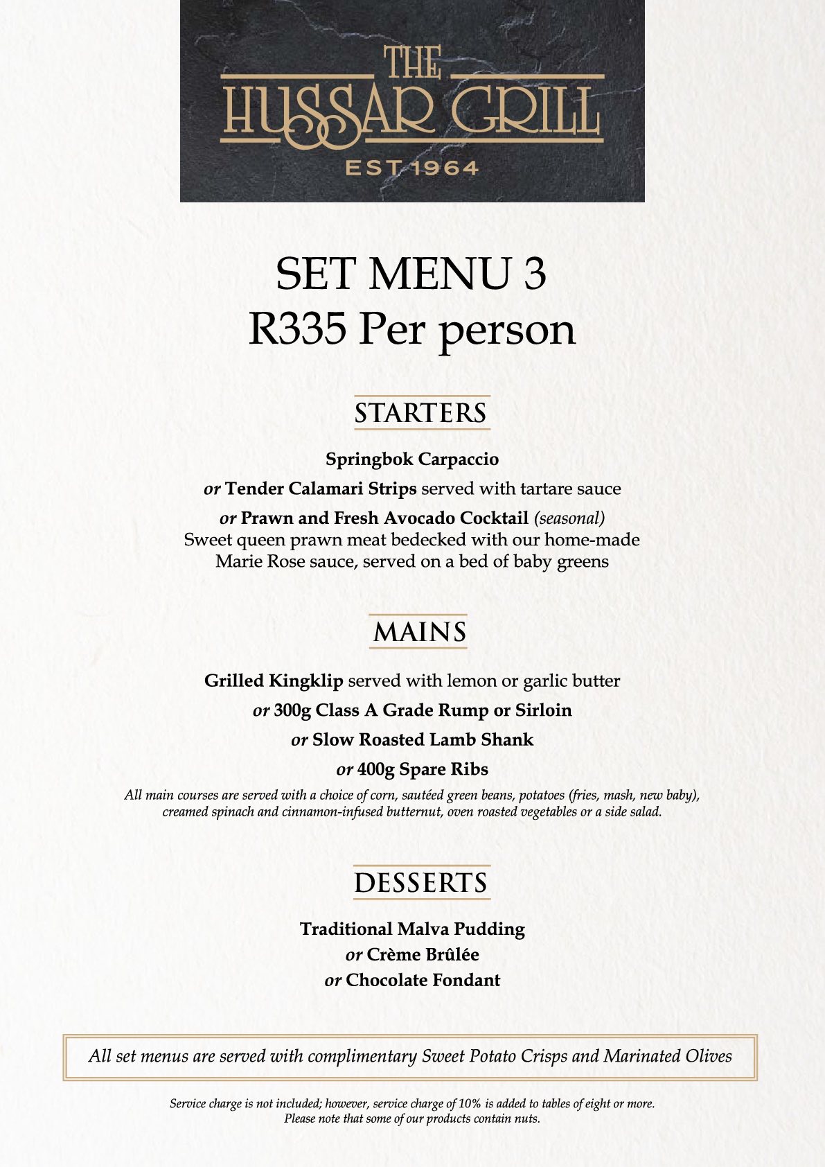 With 53 years of award-winning excellence, The Hussar Grill remains, as ever, with pleasure and always at your service. Regarded as one of South Africa’s premier grill rooms, they have three stellar set menu options you can choose from for your function.