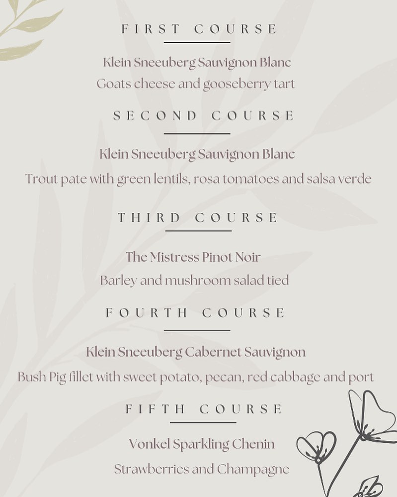 This special event will take place on Friday, February 17th at 6:30 pm and is priced at R585.00 per person, which includes a paired wine selection and 5 delectable courses.
