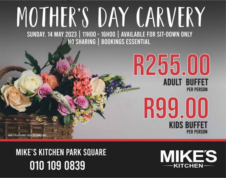 - On May 14th, Mike’s Kitchen will be offering a special Mother’s Day Carvery, giving families the chance to indulge in a scrumptious feast without having to worry about cooking or cleaning up afterwards. For just R255 per adult and R99 per child, you can enjoy a range of mouth-watering dishes, from succulent roast beef to crispy roast chicken, alongside a selection of tasty sides and salads.