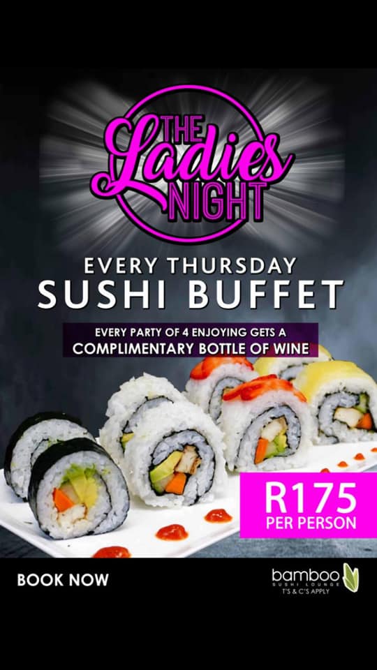 Ladies are getting the special treatment at their sushi buffet on Thursdays by paying R175 only for all-you-can-eat. Dust off your chopsticks and rainbow-roll your way down to Bamboo Sushi Lounge – there’s something for everyone.