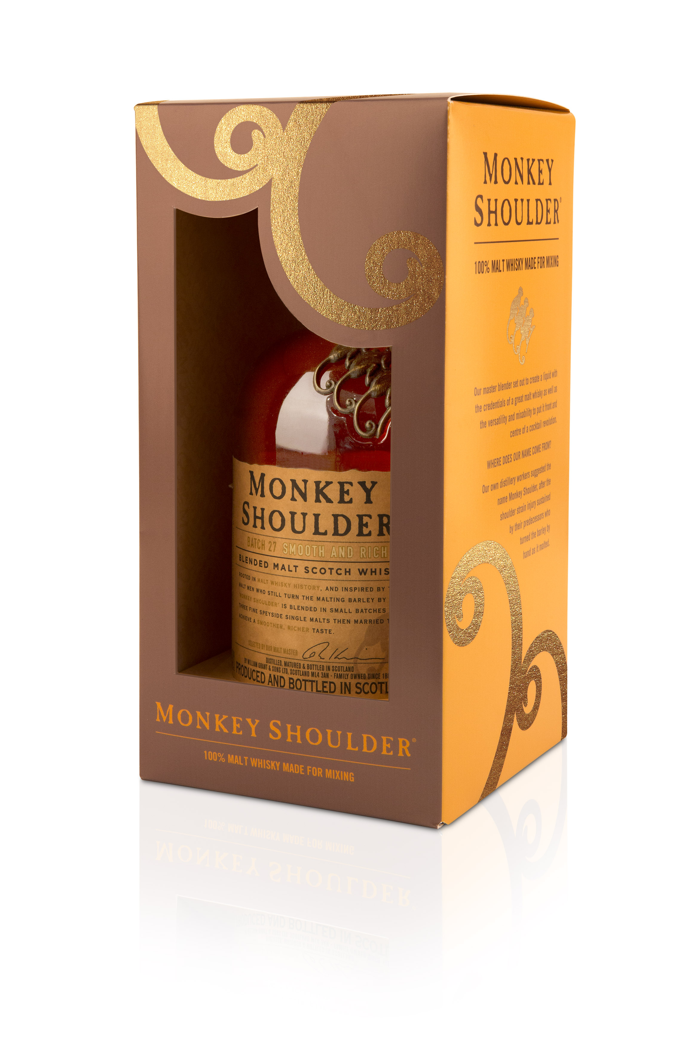 Monkey Shoulder is a 100% malt whisky made for mixing, created by expertly blending small batches of different speyside single malts together. Richness and vibrancy combine with fruity aromas and mellow vanilla notes, making it perfect for mixing. With a playful attitude and commitment to the unconventional we are bringing great scotch to a new generation of whiskey drinkers.