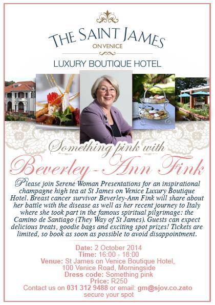 Breast cancer survivor Beverley-Ann Fink will share about her battle with the disease as well as her recent journey to Italy where she took part in the famous spiritual pilgrimage: The Camino de Santiago (The way of St. James).