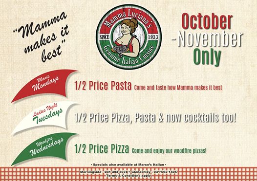 During October & November, they are offering great specials every Monday, Tuesday and Wednesday. Half price pizza and half price pasta specials are available. Please make sure you book your table to avoid being disappointed. With specials like these, the restaurant is bound to be full.