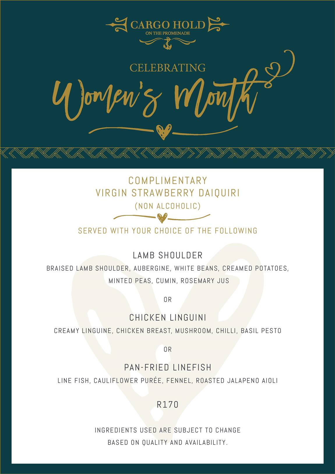 There is a special menu just for you. Choose from either lamb shoulder with aubergine and creamed potatoes, creamy linguine with chicken and mushroom or linefish with cauliflower pureé and fennel for only R170 and get a complimentary virgin strawberry daiquiri.