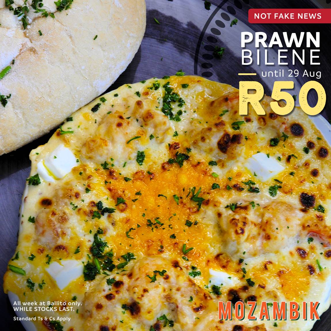 Mozambik is inviting you to enjoy their famous prawn bilene, 6 de-shelled prawns in a creamy cheese and feta sauce for only R50!