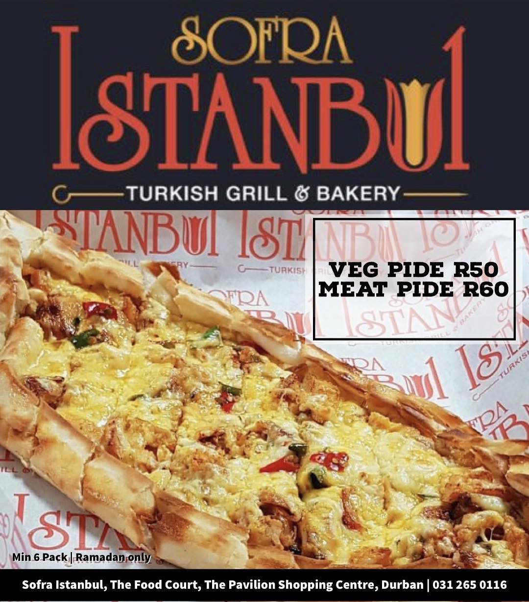 Their Ramadaan Pide Special includes Vegetable Toppings for R50 and Meat Toppings for R60. The offer is valid when purchasing a minimum of 6 pides. Pides may be ordered baked or half-baked.