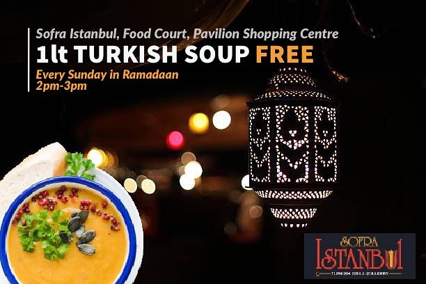 Every Sunday this Ramadaan, Sofra Istanbul is generously offering a FREE 1lt bucket of Turkish soup between 2pm and 3pm. You can visit their restaurant at the Pavilion shopping mall for collection.