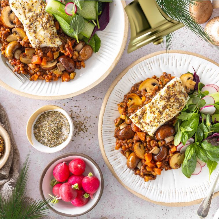 - Serve the roasted hake on a bed of the warm mushroom lentils along with a crunchy green side salad and enjoy!