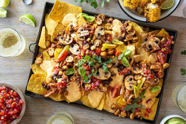 Mushroom Loaded Nachos with Homemade Queso (cheese sauce)