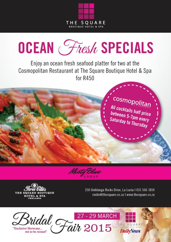 Enjoy an ocean fresh seafood platter for two at the Cosmopolitan Restaurant at The Square Boutique Hotel & Spa for only R450. On every day (except Friday), you can also order all cocktails at half-price during happy hour which lasts from 17h00 – 19h00.