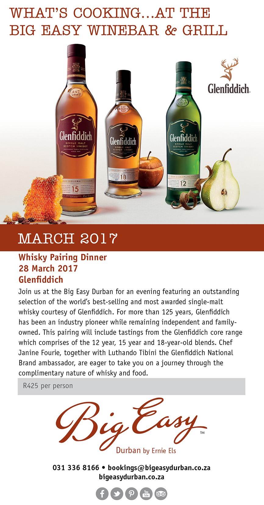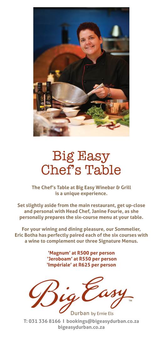 The Chef’s Table at the Big Easy Winebar & Grill is a unique experience. Set slightly aside from the main restaurant, get up-close and personal with Head Chef Janine Fourie, as she personally prepares the six course menu at your table. For your wining and dining pleasure, the in-house Sommelier Eric Botha has perfectly paired each […] More