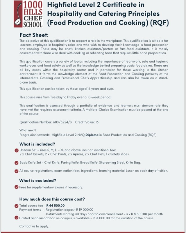With 1000 Hills Chef School’s latest offering: the Level 2 Certificate in Hospitality and Catering Principles (Food Production & Cooking).