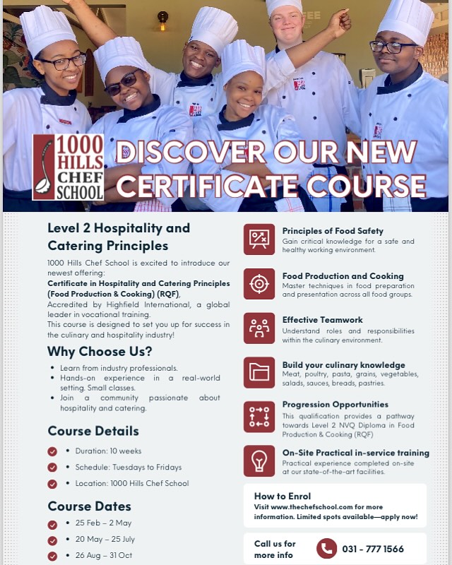 With 1000 Hills Chef School’s latest offering: the Level 2 Certificate in Hospitality and Catering Principles (Food Production & Cooking).
