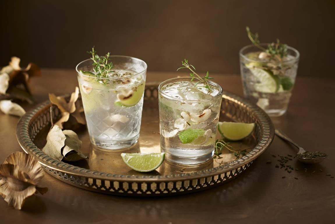 - Float the charred cashews on top of your G&T. Sprinkle a mere pinch of the tempered fennel on top. Take the sprig of fresh thyme, smash it between the palms of your hands then float it on top.