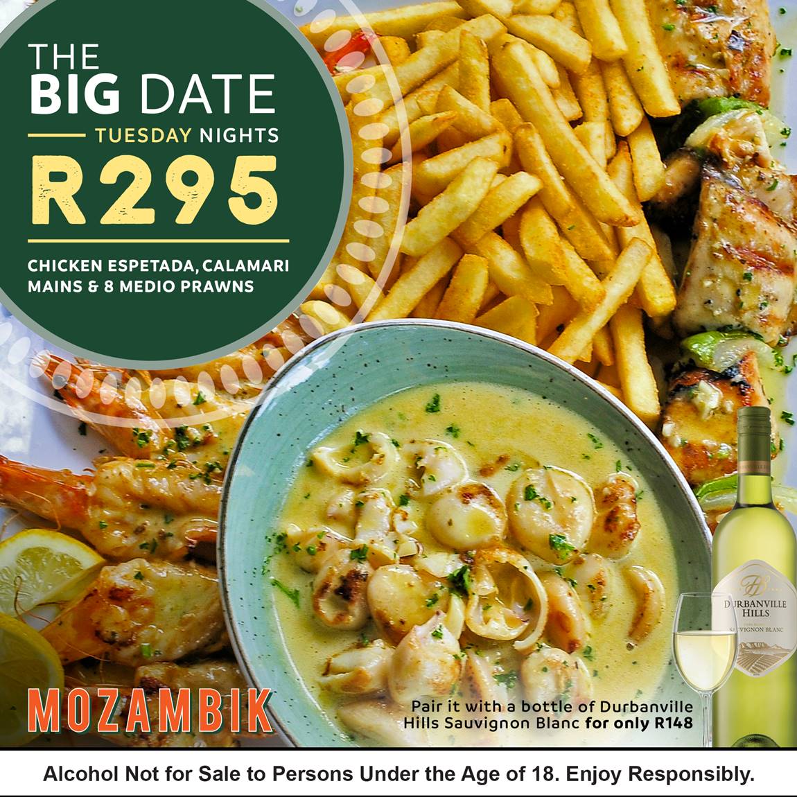 Enjoy a platter of chicken espatada, calamari mains and 8 medio prawns with a side for only R295 per couple. Add a bottle of Durbanville Hills Sauvignon Blanc for only R148.