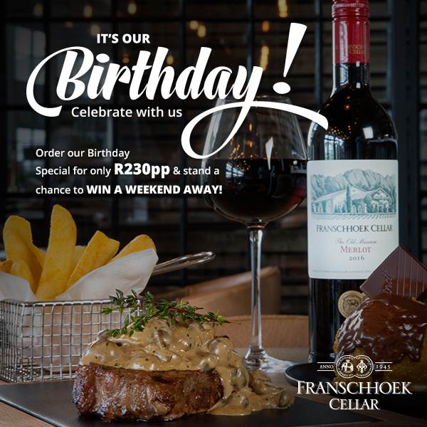 To stand a chance of winning a weekend away for 2 at the Franschhoek Cellars Cottage in Cape Town all you have to do is order the incredible birthday special, which is available for lunch and dinner