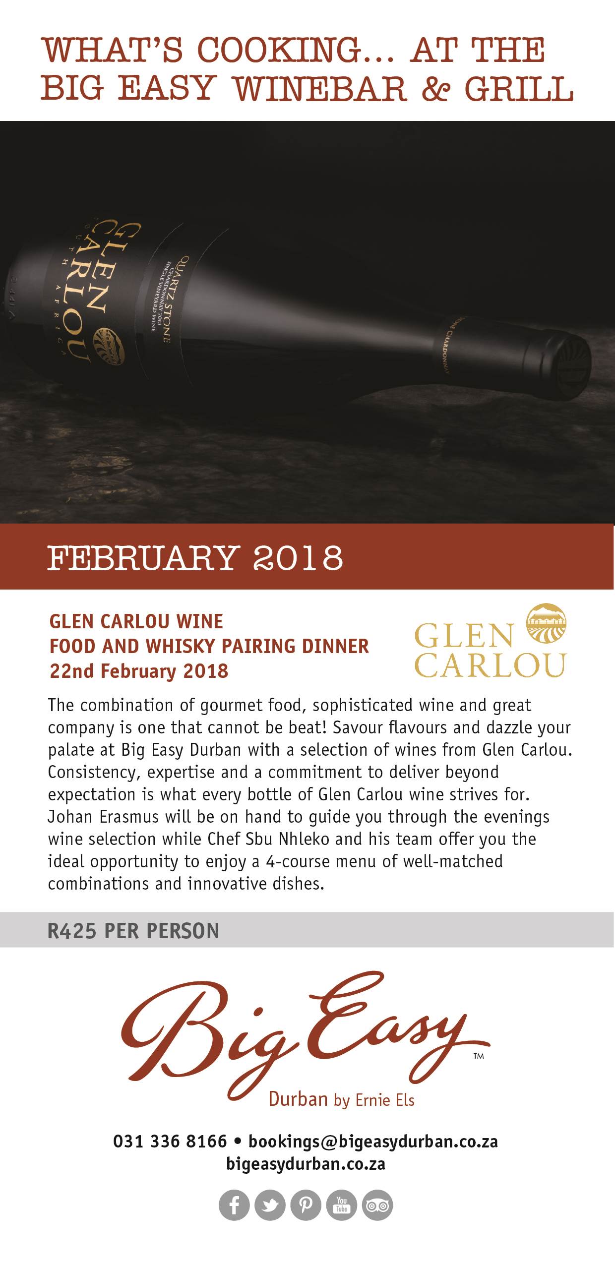 The Big Easy Winebar & Grill will be inviting Glen Carlou Wine Estate to hose a wonderful wine & dine evening on the 22nd of February.