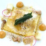 Puree, pickled apples, shaved radish and sage beurre noisette