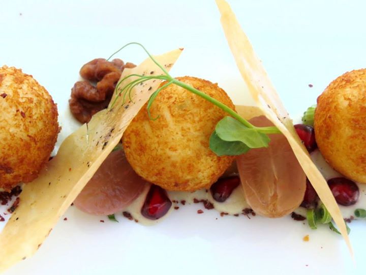 Pickled grapes, candied walnuts, pomegranate, aubergine puree, sumac and filo crisp