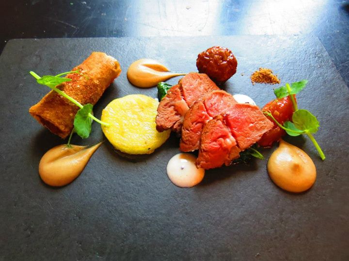 Kofta, crispy pastilla, sweet potato, tomato harissa and aubergine puree