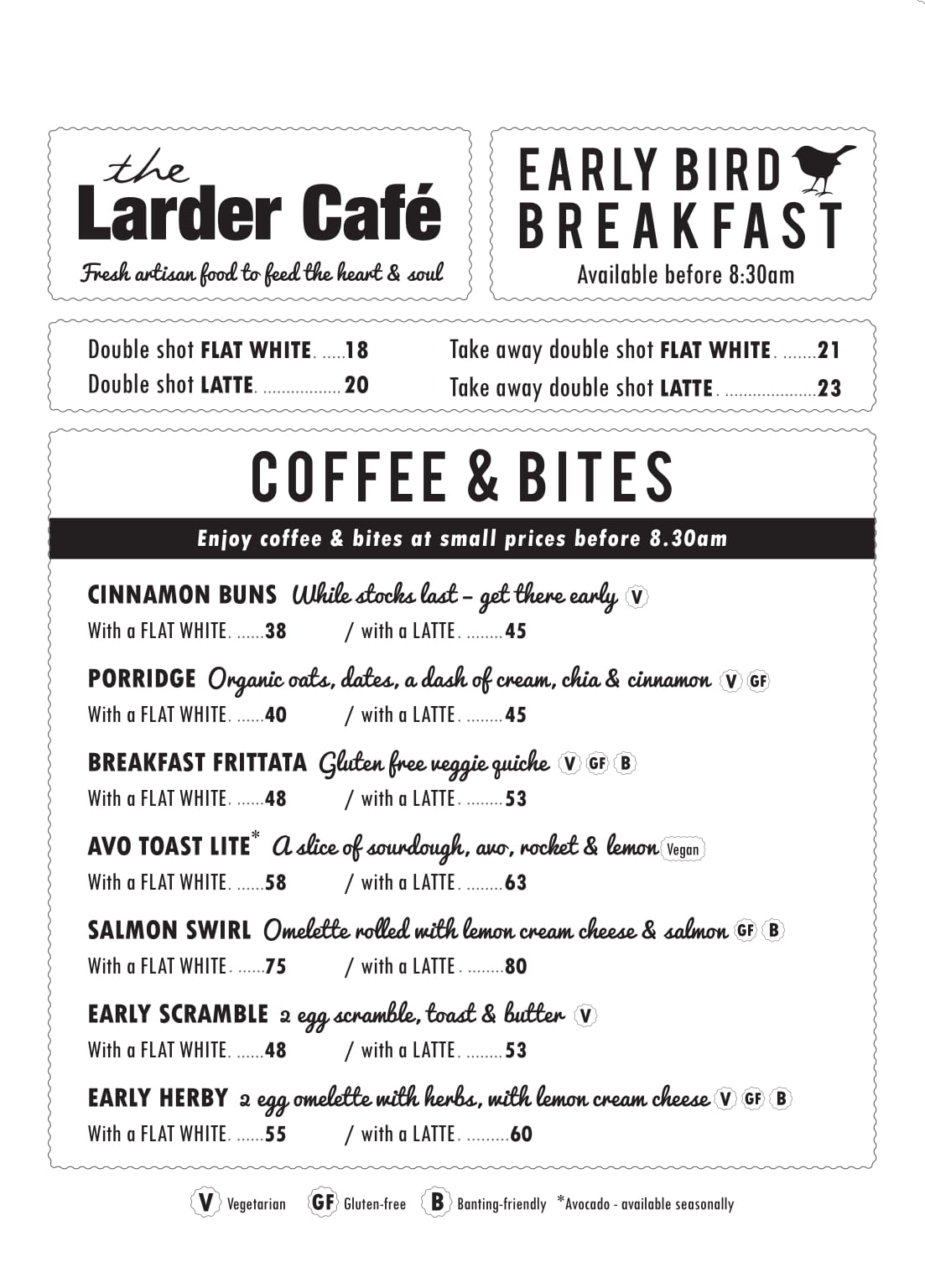 Believing we are what we eat, the chef at The Larder Cafe only uses the freshest artisan and seasonally sourced ingredients to cook up dishes from scratch to fill your belly & warm your heart.