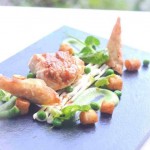 Crispy pastilla, parmesan gnocchi, baby gem lettuce and pea puree
