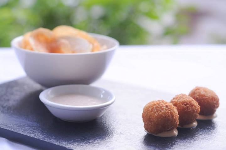 Salty crisps, ‘cocktail’ espuma, sweet corn arancini