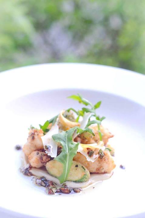 calamari, artichoke puree, spring vegetables, rocket, chilli and lime dressing
