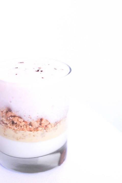 Vanilla panacotta, custard, orange meringue, black pepper crumble and rhubarb espuma
