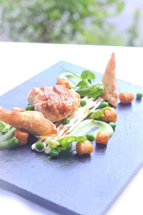 Crispy pastilla, parmesan gnocchi, baby gem lettuce and pea puree