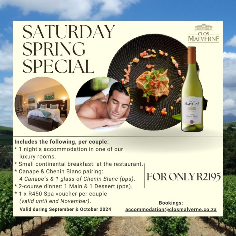 This offer is valid for weekends in September and October 2024, so don’t miss out on this refreshing spring escape. For bookings, contact Michelle at accommodation@closmalverne.co.za and prepare for a memorable weekend retreat at one of Stellenbosch’s finest estates.