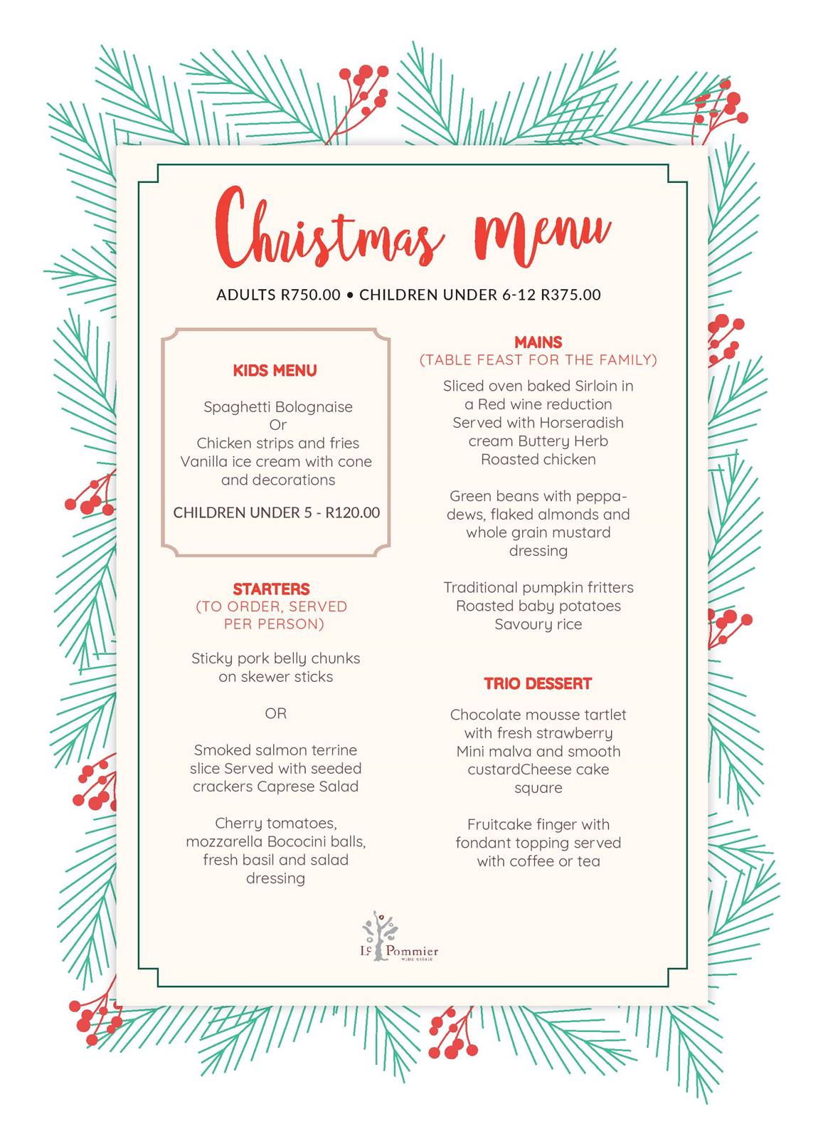 • For mains, a family-style table feast awaits with oven-baked sirloin in red wine reduction, buttery herb roasted chicken, and sides like pumpkin fritters and roasted baby potatoes. Along with a selection of starters, your meal also includes a trio dessert of chocolate mousse tartlet, mini malva pudding, and cheesecake squares. [full menu below]