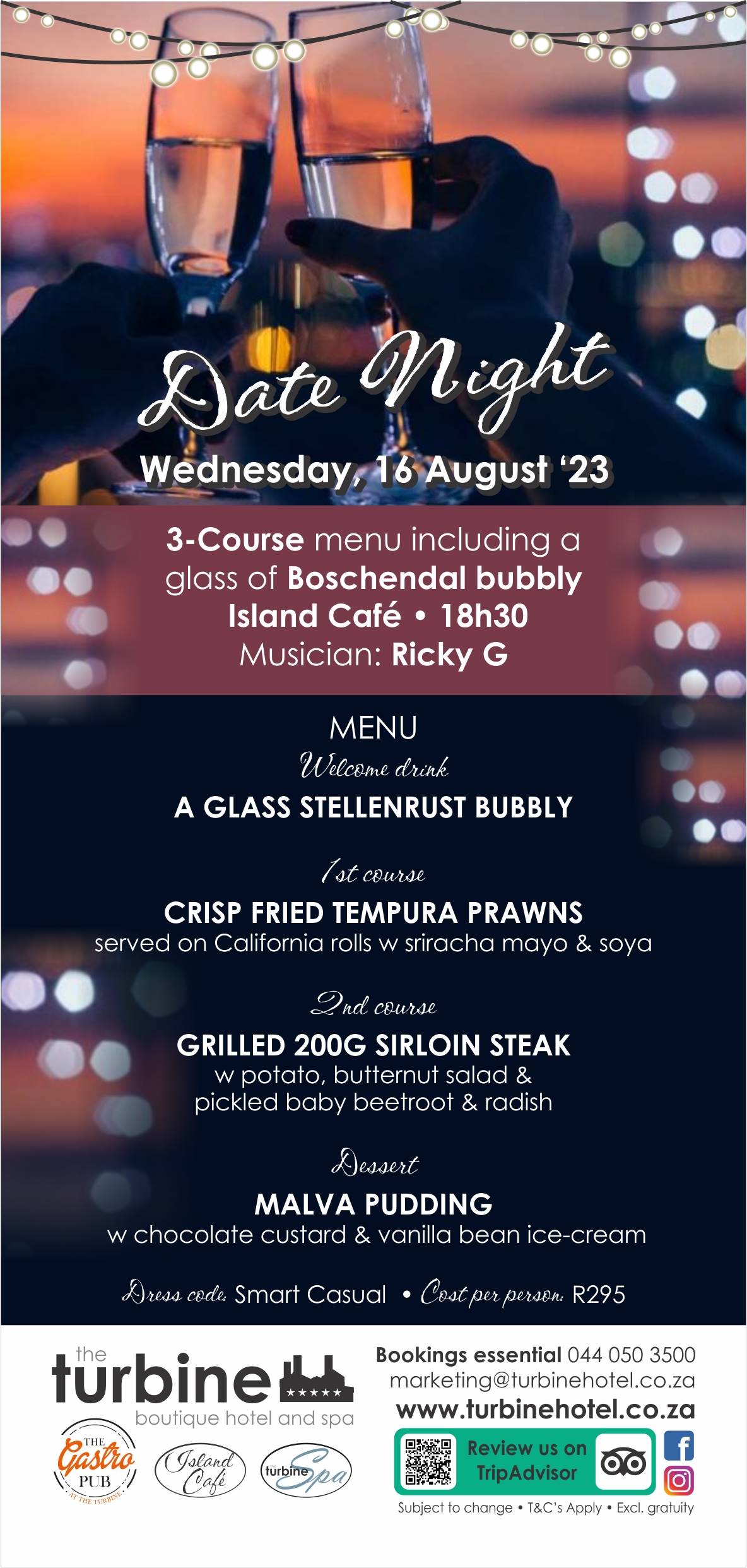 Escape the mundane and treat yourself and your loved one to a mesmerizing date night at Turbine Hotel’s Island Cafe in Knysna.