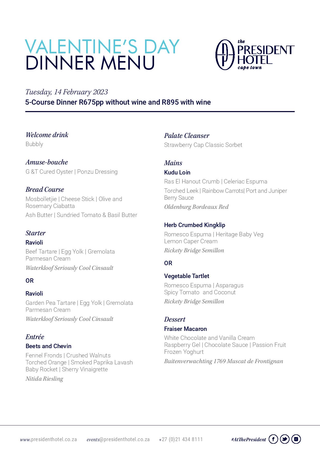 The dinner will take place on 14 February 2023 from 6 pm, and will feature locally inspired dishes that will tantalize your taste buds. The menu includes G&T cured oysters with a ponzu dressing for the starter, a bread course, ravioli, kudu loin, herb crumbed kingklip, vegetable tartlet and a selection of desserts to end your meal on a sweet note. (full menu below)