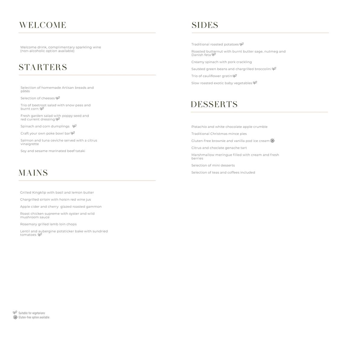 - Save room for the decadent dessert selection, featuring pistachio and white chocolate apple crumble, gluten-free brownies with vanilla pod ice cream, and festive mini treats. A range of teas and coffees completes the meal, ensuring a memorable Christmas celebration.