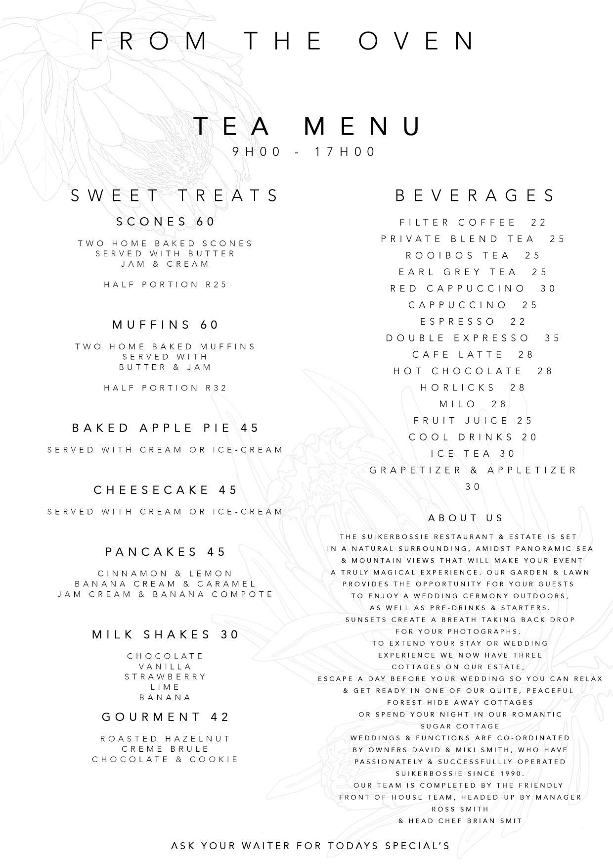 A location fit for sipping on a cup of perfectly brewed tea and treating yourself to something a little indulgent. For a morning catch-up or afternoon break, take a moment at Suikerbossie to enjoy one of life’s simple pleasures, a cup of well-made tea.