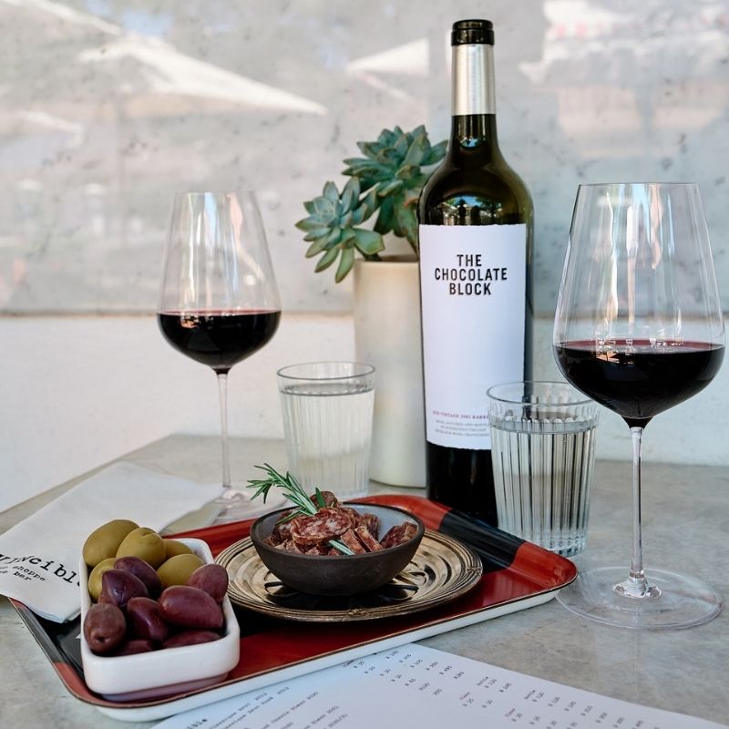 This includes two glasses of Red (The Chocolate Block) or White (Patina Chenin Blanc) & delicious wine bar nibbles of imported olives and French cured saucisson.