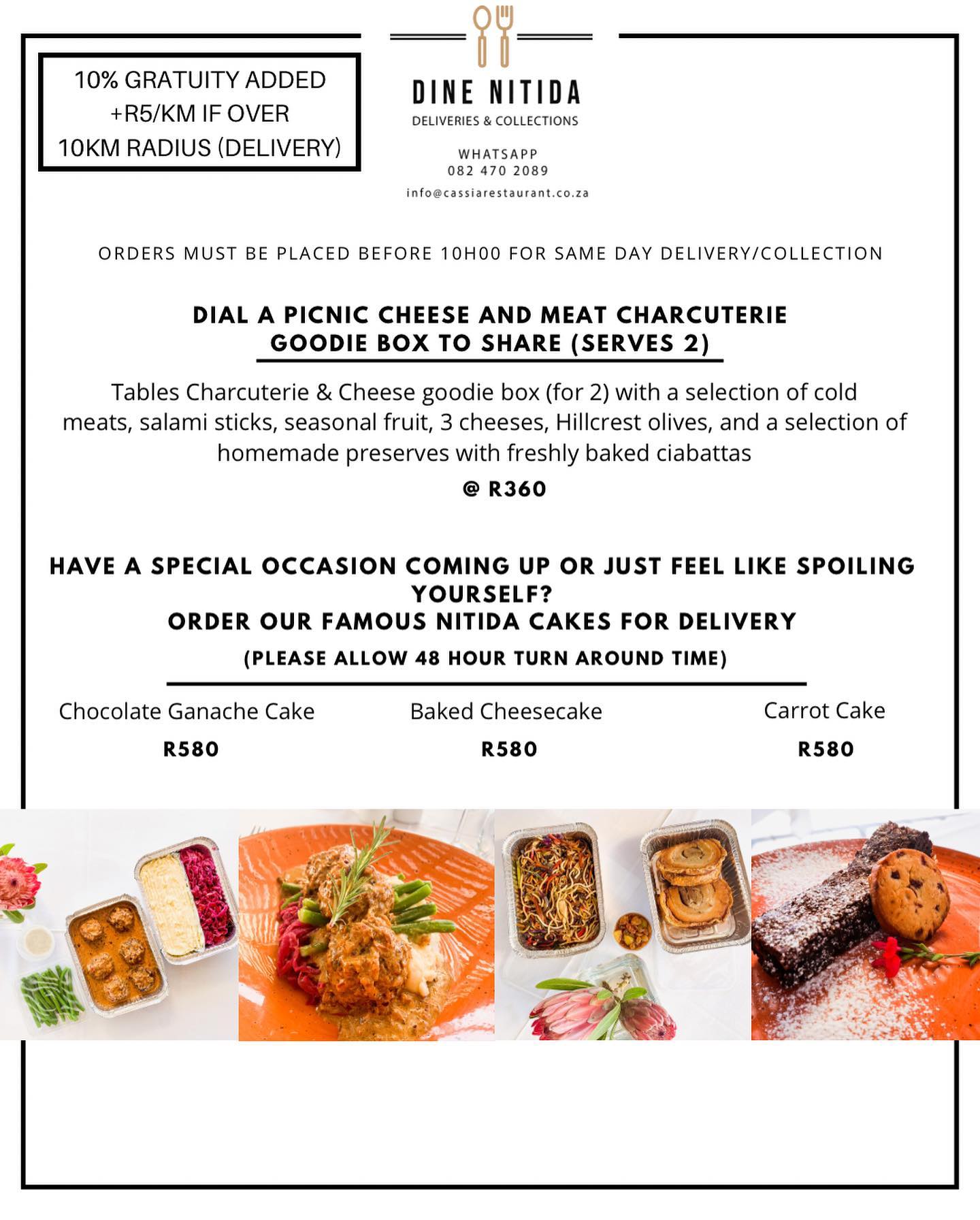 The picnic box includes a Tables @ Nitida Charcuterie & Cheese goodie box for two people with a selection of cold meats, salami sticks, seasonal fruit, 3 cheeses, Hillcrest olives and a selection of home-made preserves with freshly baked ciabattas.