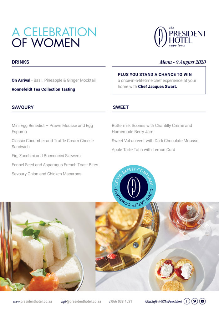 Specially prepared by The President’s culinary team, each at-home kit includes a selection of sweet and savoury treats complemented by a selection of teas. Also priced at R245 per person with FREE delivery to the Atlantic Seaboard areas.