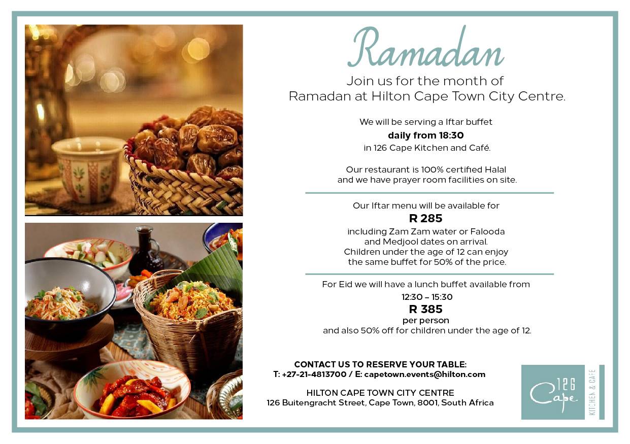 Thanks to 126 CKC Restaurant you don’t have to slave away in the kitchen after a hard day’s work of fasting. Instead just gather the whole family and take a short trip down to 126 CKC Restaurant where you can enjoy a delicious, 100% Halaal Baffet which includes scrumptious delectable’s like Medjool dates on arrival with either Zam Zam water or the always delicious Falooda.