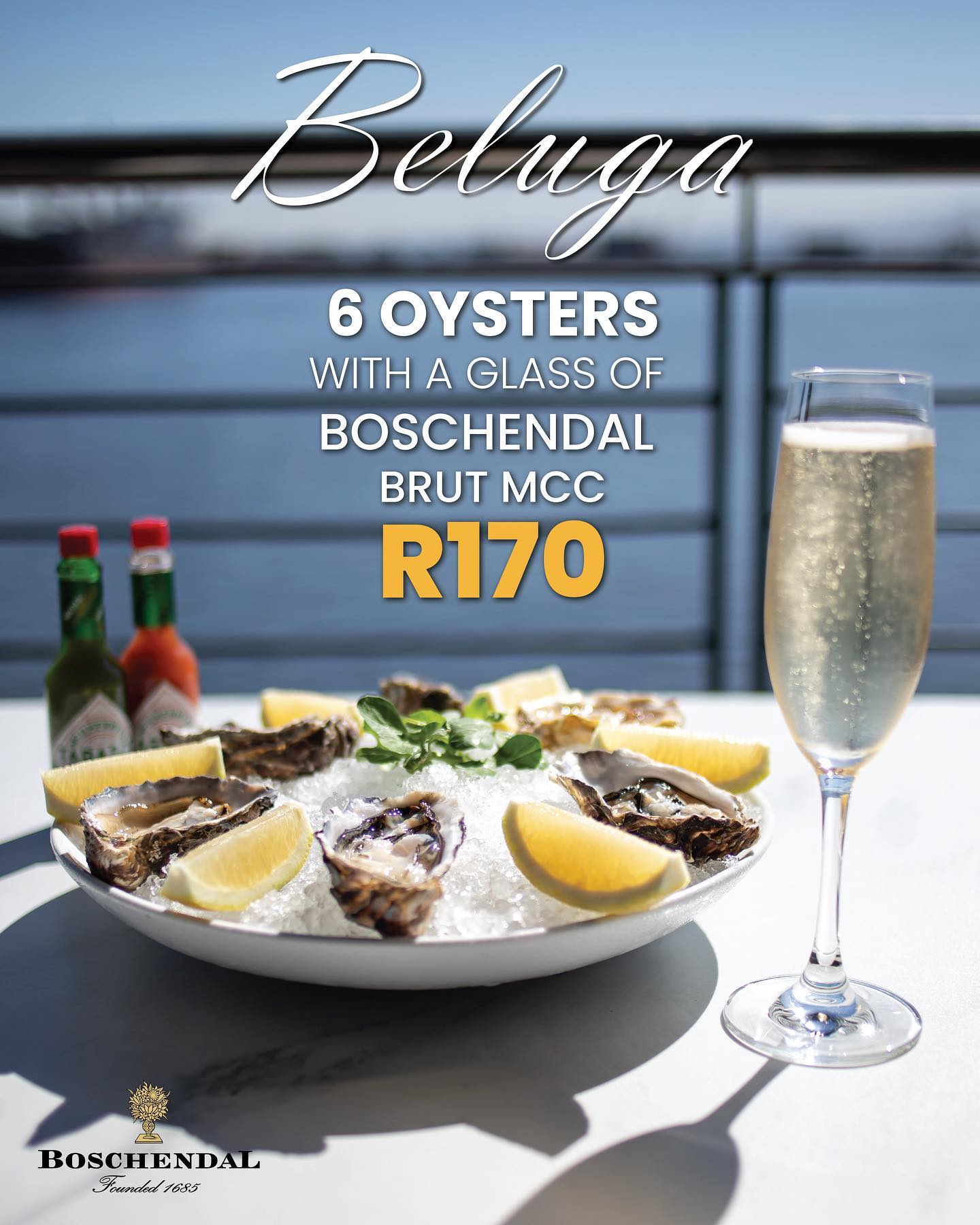 For just R170, you can enjoy a plate of six succulent, juicy oysters paired with a glass of Boschendal Brut MCC. This is an offer you won’t want to miss!