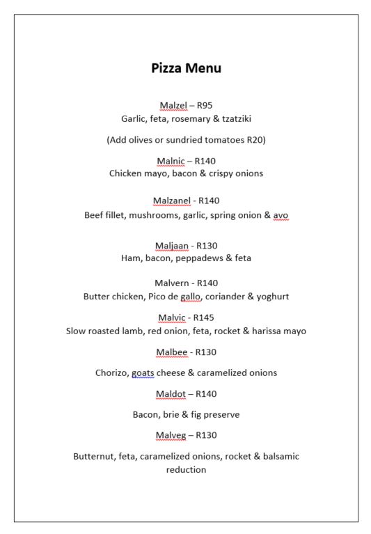 Experience the culinary excellence of Clos Malverne Restaurant and explore their full pizza menu today.